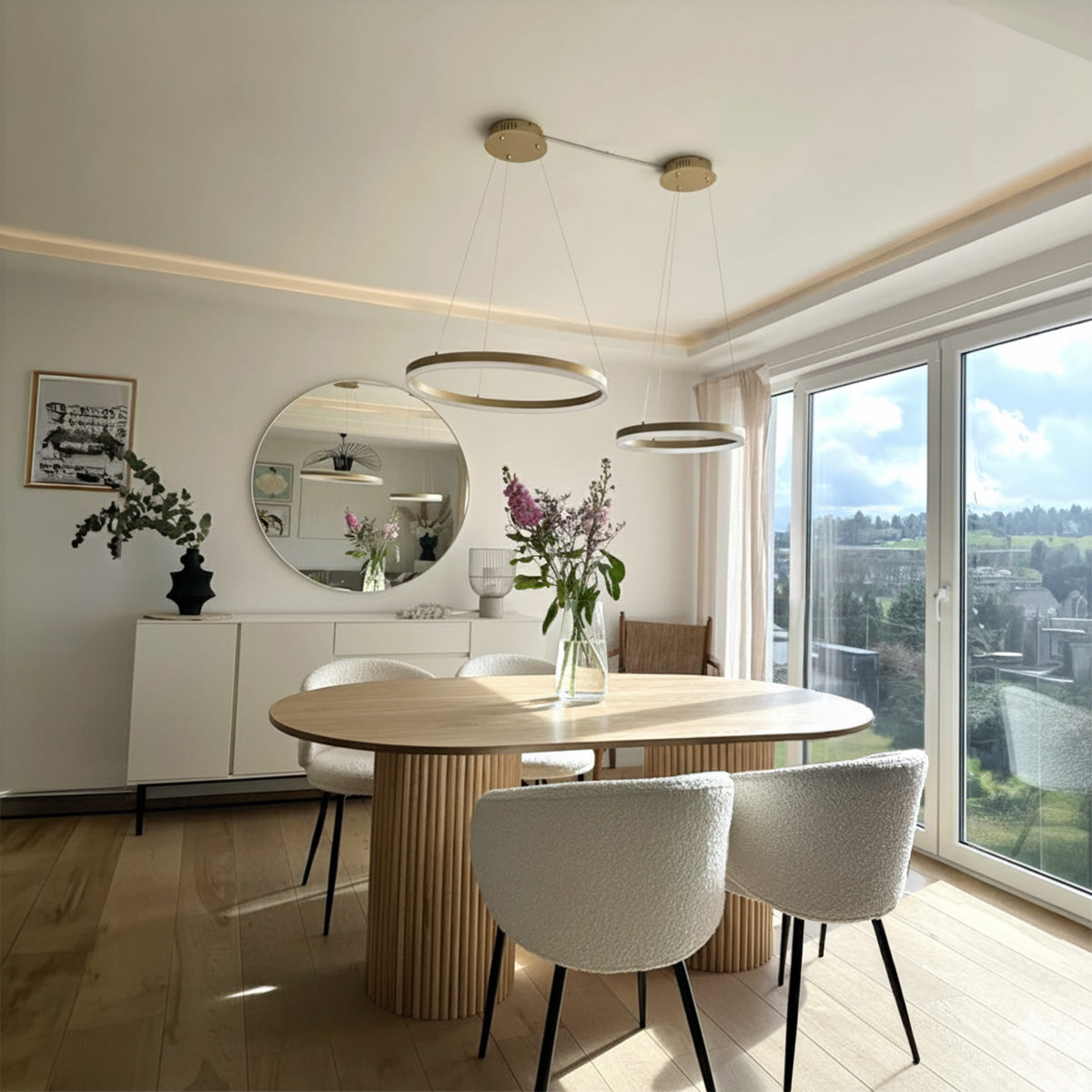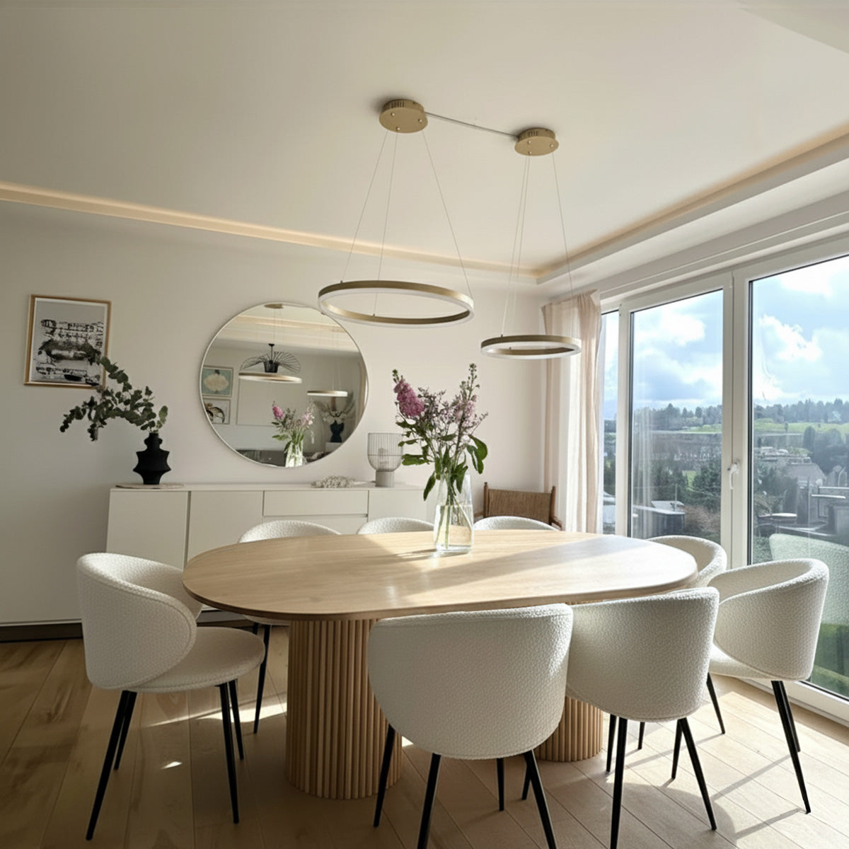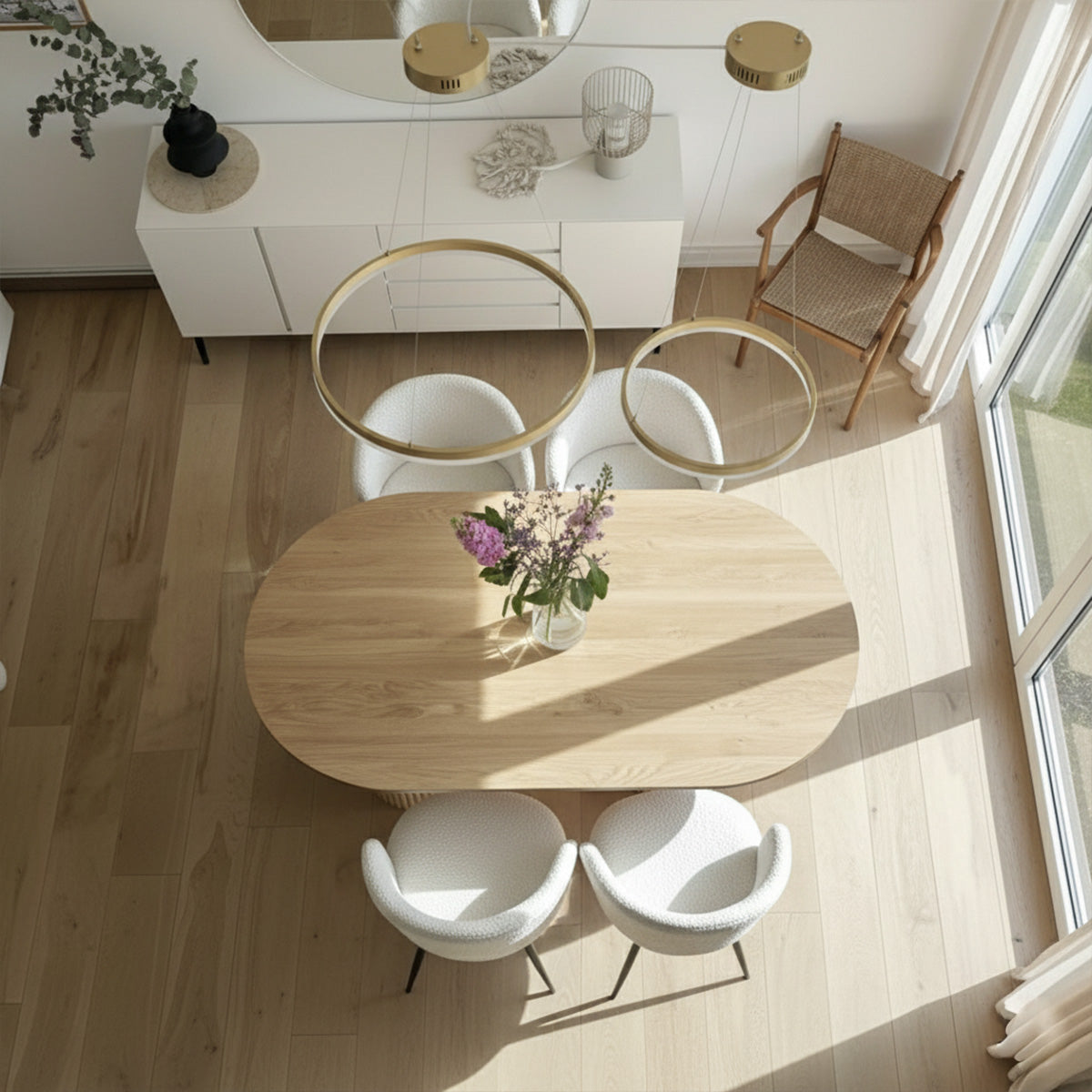 Elevate your home with the Serene Dining Set. This 4-seater features an oval wood table with a unique slatted pedestal base. The chairs combine a comfortable, curved silhouette with luxurious cream bouclé upholstery and contrasting black metal legs—a perfect mix of texture and contemporary style.